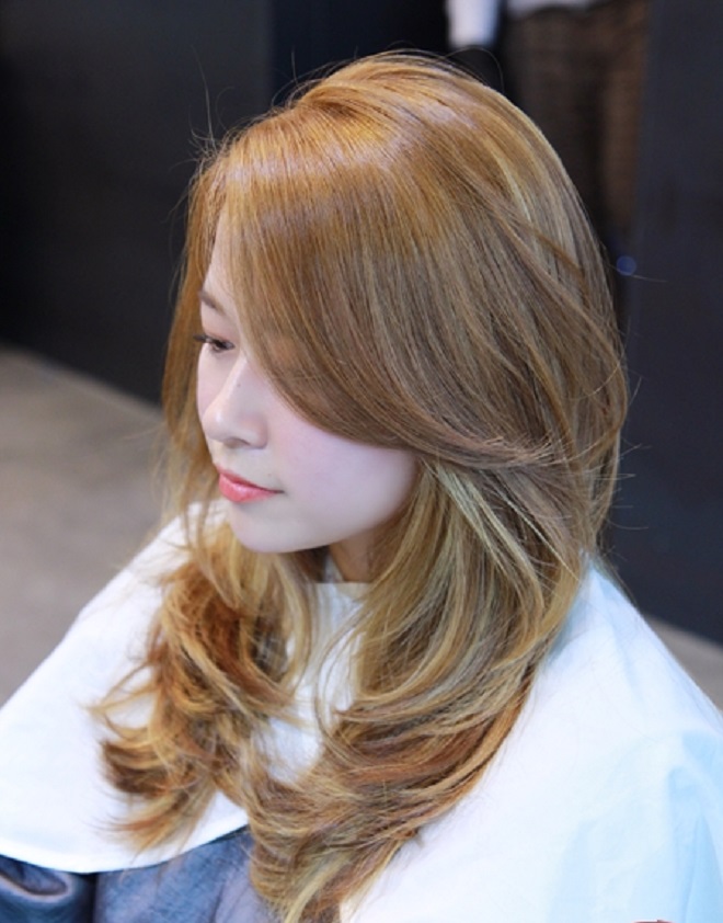 시술명: 골드 브라운 특징:   금빛의 반사빛을 가진 밝은 브라운, 실내에서는 골드브라운, 야외에서는 블론드 컬러 연출 시술법: 뿌리부분만 염색을 하여 전체 톤 차이를 줄이고, 포일 테크닉으로 부분 탈색 후, 컬러 작업