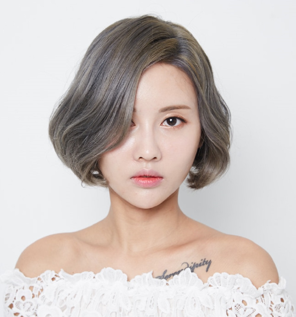 시술명: 단발 쿠션 펌  특징: 단발 길이의 상큼 발랄한 이미지와 애쉬 계열의 음영 컬러로 입체감을 주고, C컬 웨이브펌으로 자연스러운 볼륨감과 6:4 가르마로 얼굴이 더 작아보이는 단발 쿠션 펌
