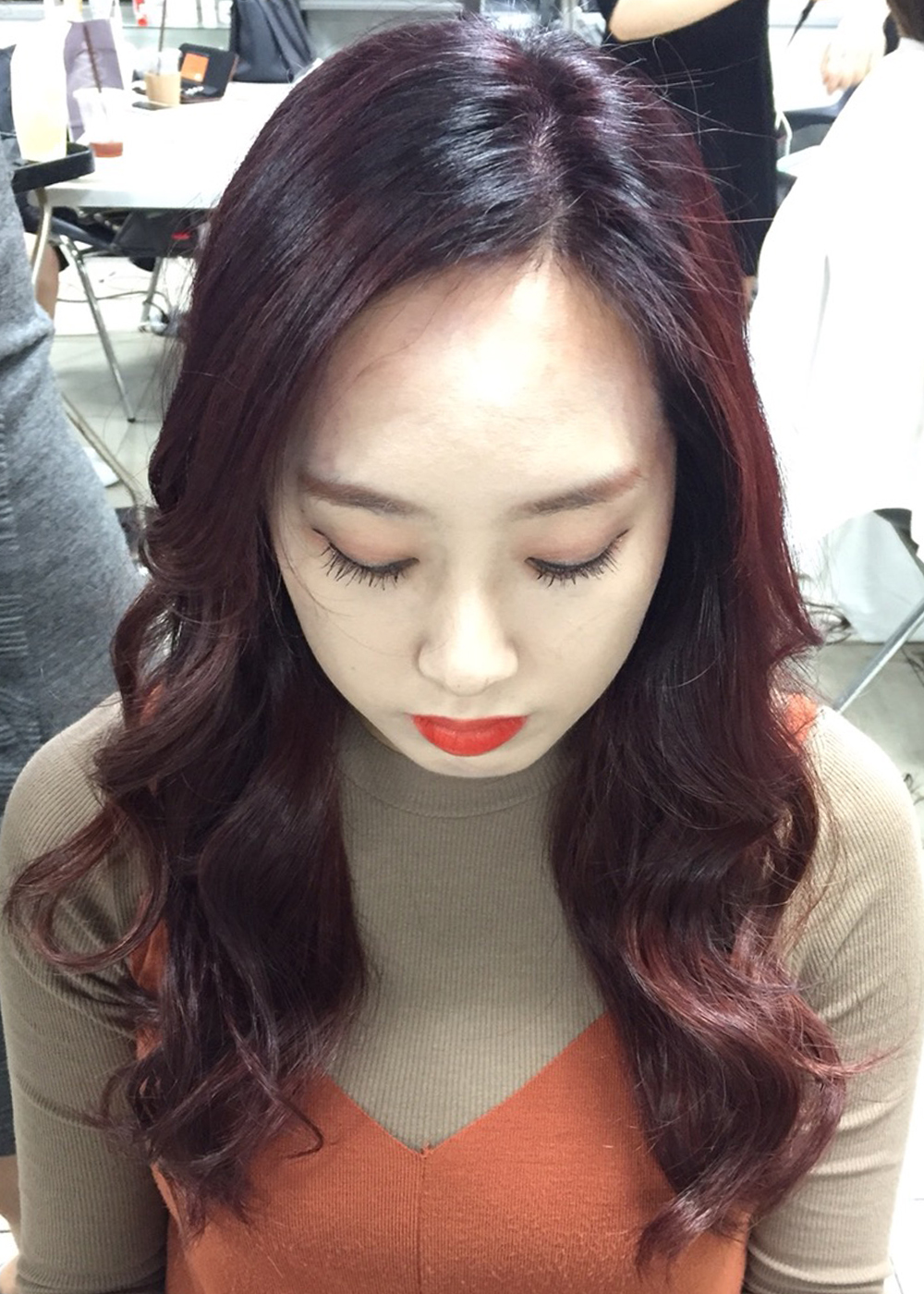 시술명: 바이올렛 그라데이션 컬러 특징: 자주빛 보라색과 베이비 핑크로 입체감을 살린 컬러. 웨이브 컬을 넣을 때, 베이비 핑크의 밝은 색이 웨이브를 더욱 풍성하고 탱클하게 연출 추천고객: 모든 얼굴형에 잘 어울리며 숱이 많으신 분은 모발이 가벼워 보이는 효과