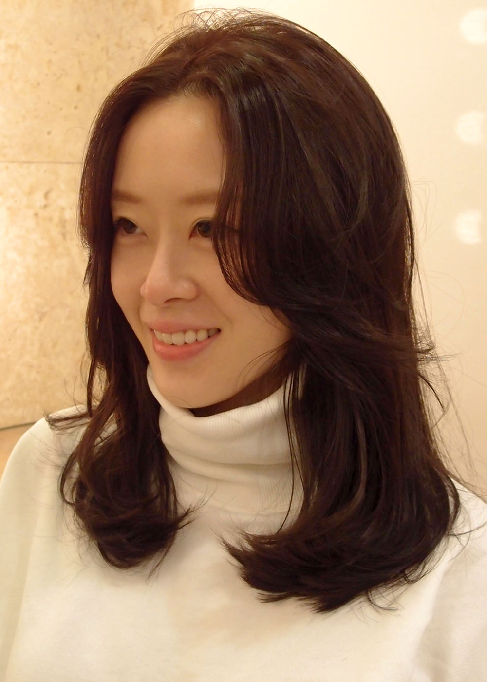 특징: 펌기가 남아있다면 커트만으로도 볼 수 있는 느낌, 기장을 살릴 수 있는 미디움기장 레이어드 컷