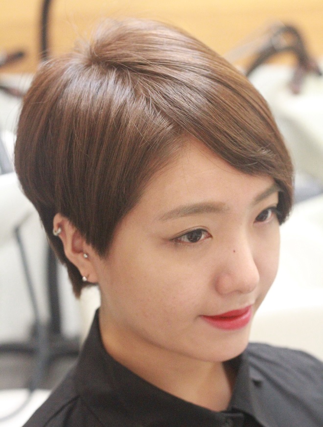 스타일명: 여자 커트 포마드 스타일 특징: 세련된 차도녀 느낌, 시크하면서 도도한 헤어스타일 연출 가능하면 남성 포마드와는 다른 소프트한 여성스러운 느낌으로 옆라인과 뒷머리의 라인을 만들고 볼륨감을 살려준다 추천하는 사람: 가르마가 보이지 않게 볼륨감을 살려주어 머리숱이 적은 고객에게도 추천, 이마가 좁은 편이거나 앞머리 부분에 잔머리가 많아서 이마라인이 답답해 보이는 고객에게 추천