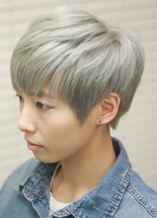 시술명:   투블럭 애쉬그레이 특징: 뒷와 옆으로 투블럭 커트의 느낌을 살려 깔끔하게 라인을 정리하여 볼륨감이 살아난다 시술방법: 탈색작업을 한 후, 얼룩이 생기지 않도록 신중하게 염색 작업을 한다 추천하는 분: 남들과는 다른 튀는 컬러를 원하는 경우
